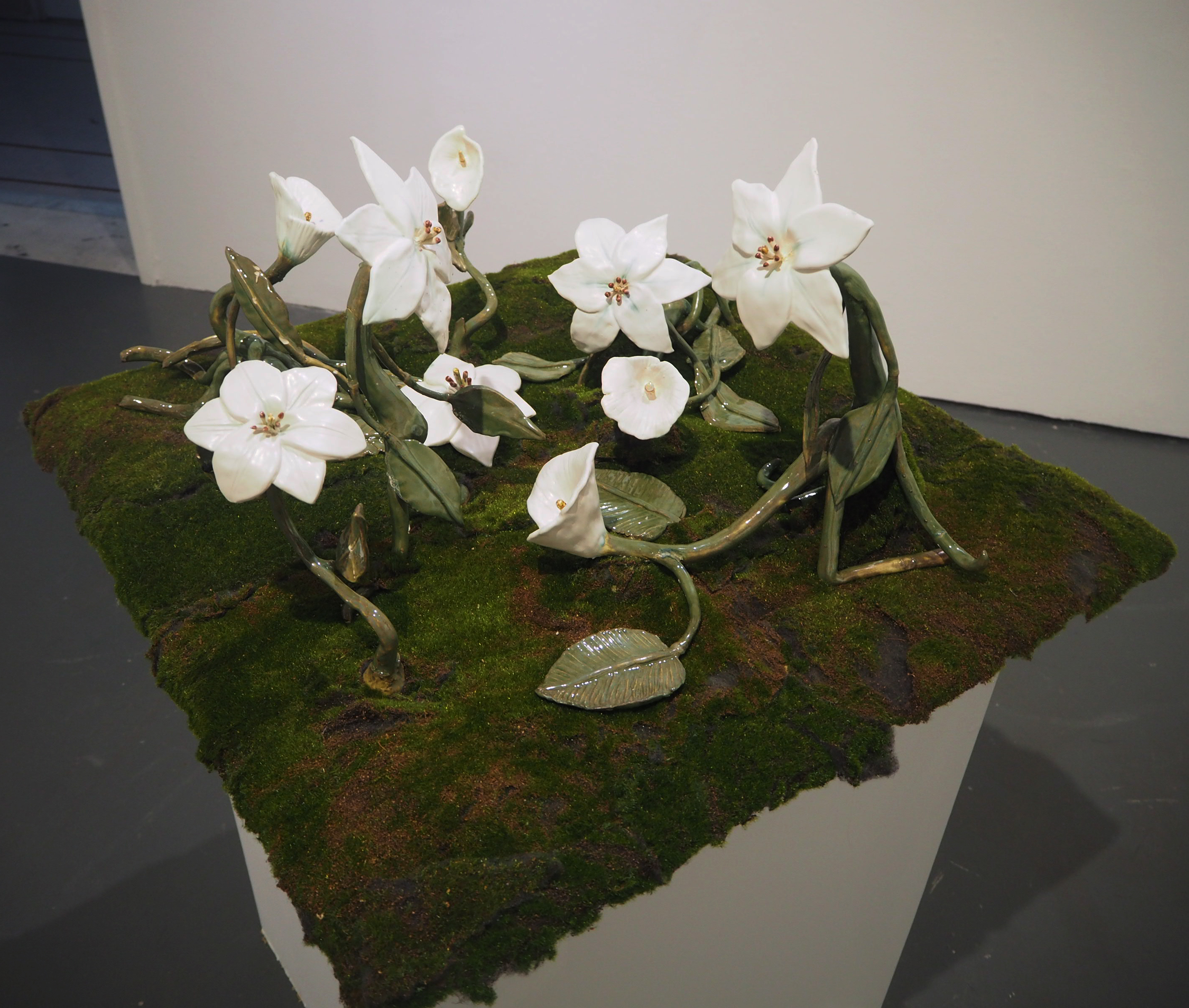 Glazed porcelain, faux moss, wood